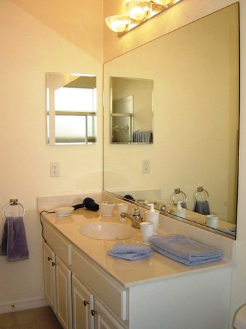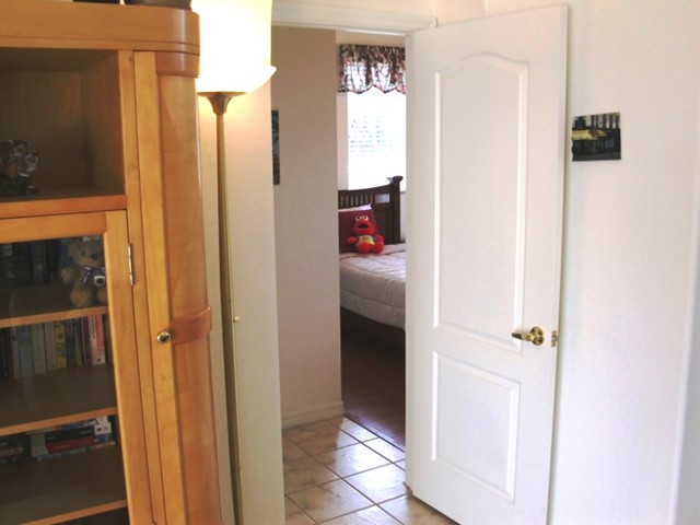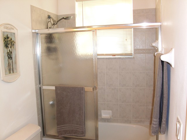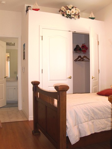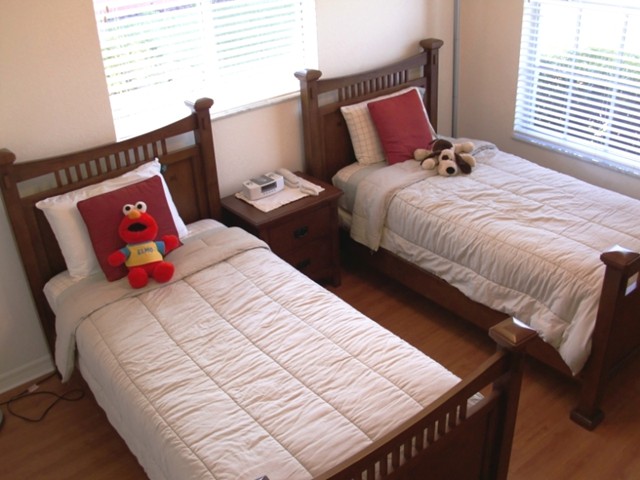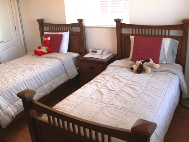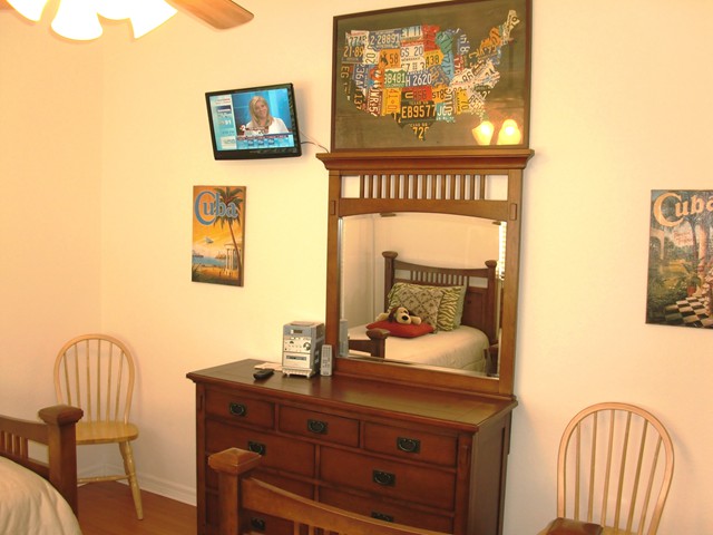 In the junior suite... ... you will find two twin size beds... and like in all other bed rooms; our high quality hard woor flooring. Store your wardrobe in the generous wall closet... Of course there is a a dresser with aplenty of room, the TV and stereo. The junior suite has its own bath also... ... with a bath tub and a bath tub door.