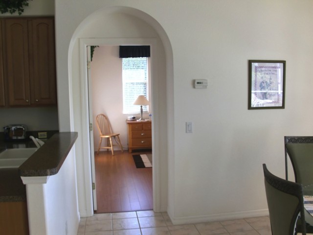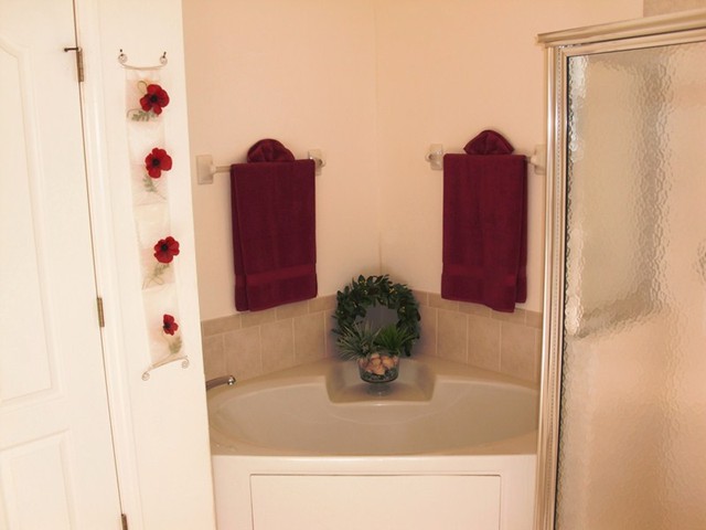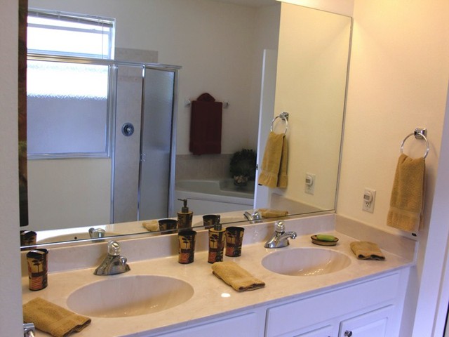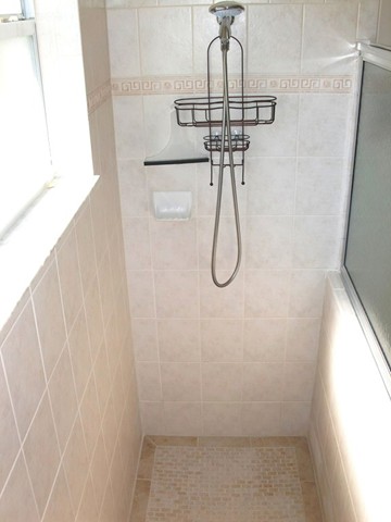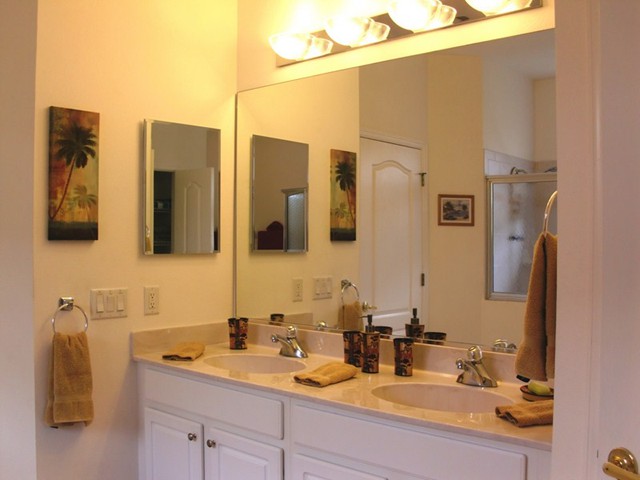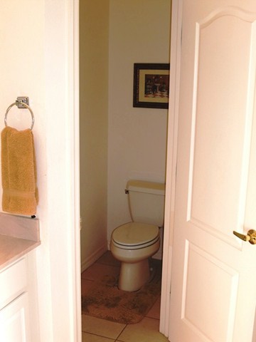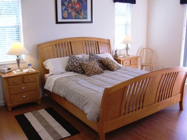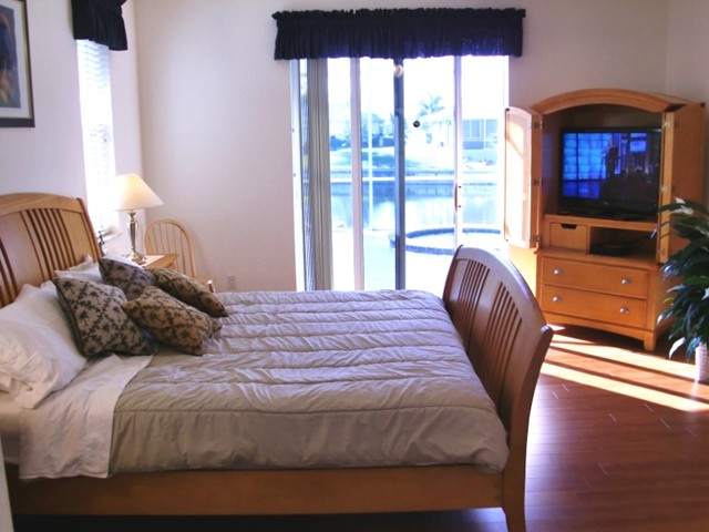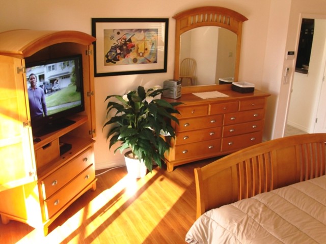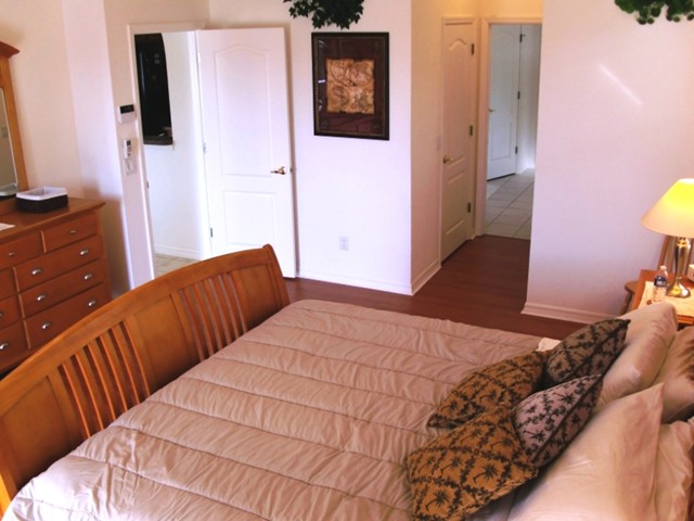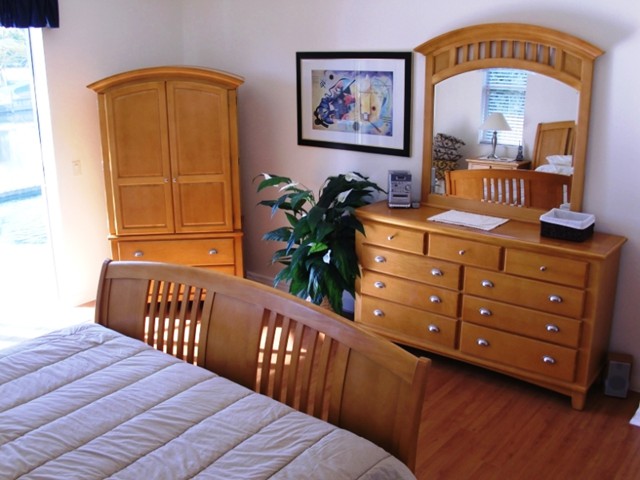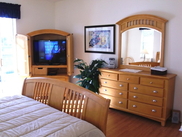 The entry to the master suite is located right next to the breakfast lounge... The master suite has an king size bed. The dresser has aplenty of room for your things. Through the glass sliding door you have direct access to the pool deck. In the amoire you will find the large HD TV and a DVD player. The furnishings are made of high quality maple. All bed rooms are equipped with cherry hardwood floring. There is a huge walk in closet with a safe for your important things between the suite and the bathroom. The master bath with two wash basin for him and her... ... you just have to bring your own tooth brush... ... The bath tub is located in the corner... ... the huge shower might be used more frequently.