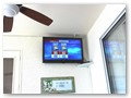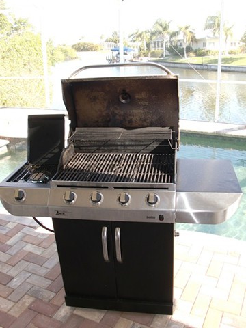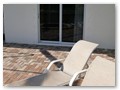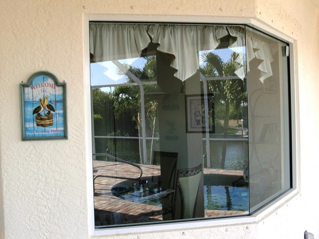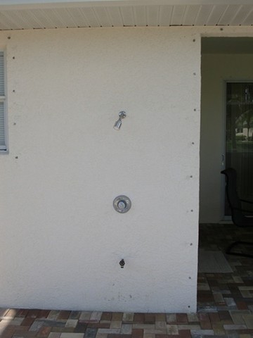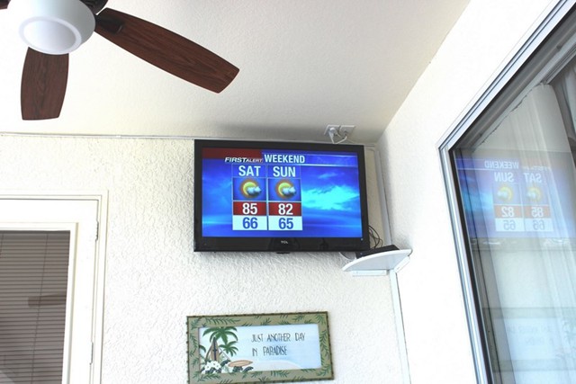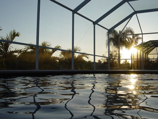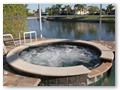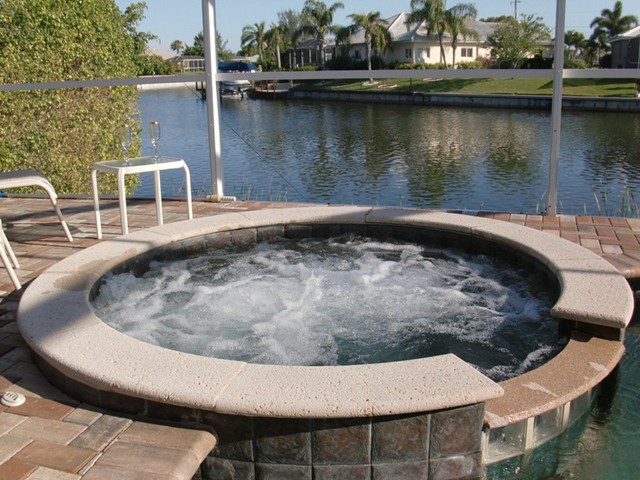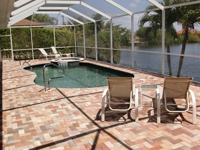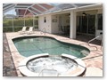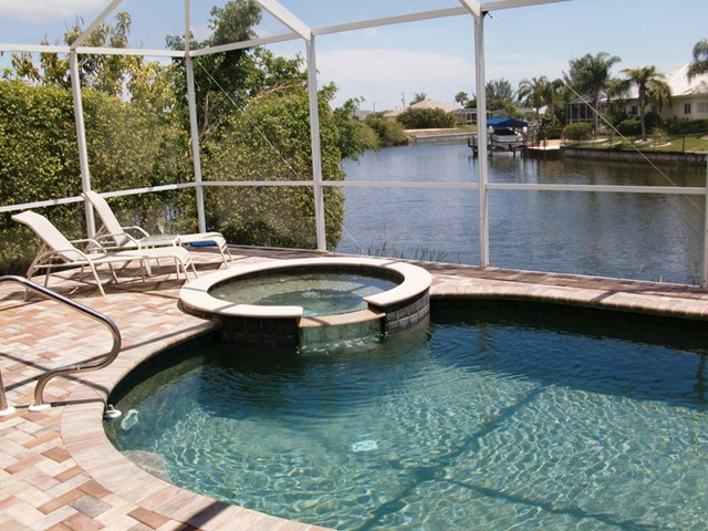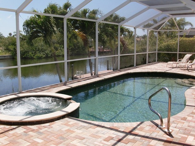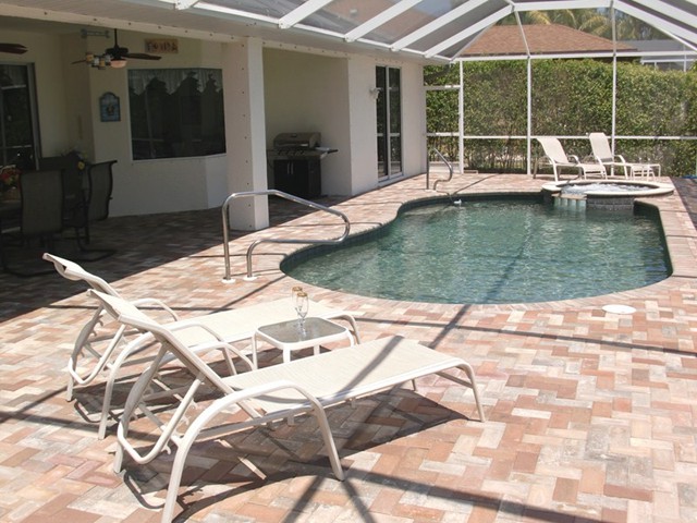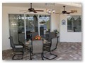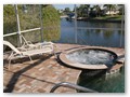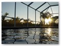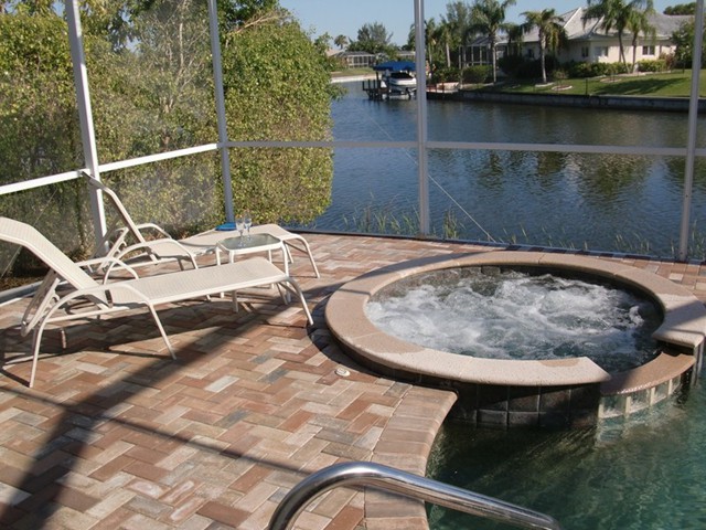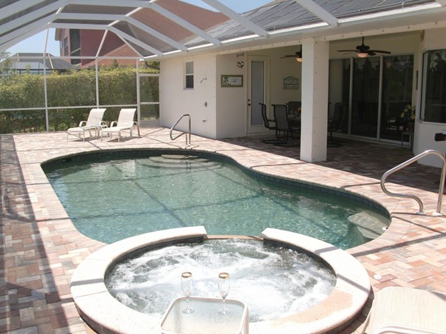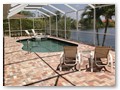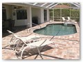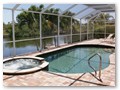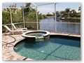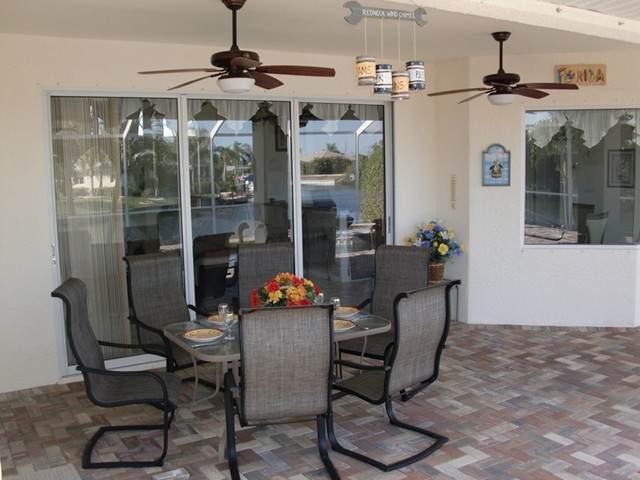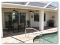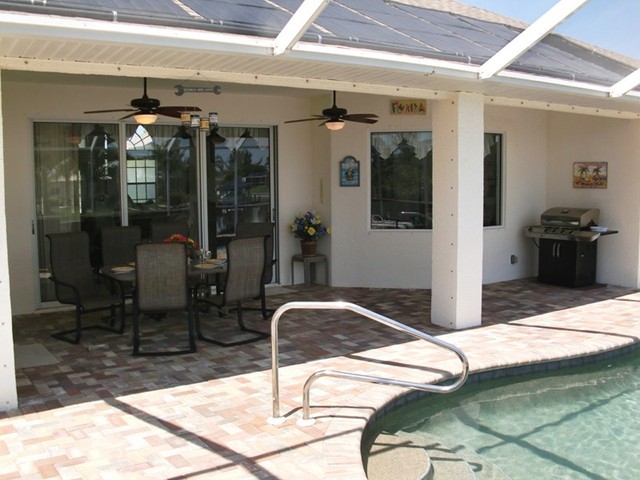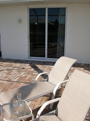 A highlight is the spacious, south facing pool deck with a beautiful view of the wide De Leon canal. The pool deck extends over the entire width of the house and offers an additional 1,600 sq.ft. space. The pool is a kidney shape pool and has solar and electric heat pump heating. There is also a hot tub  connected to the pool with waterfall spillover into the pool. The spa heats up to 102° F... ...so you even sweat in the winter time. If you like to sit in the sun and relax, there are 4 lounge chairs. The unbeatable south direction gives you sun all day long... ... you can watch even the sunset from the pool. The huge lanai under roof will spend shade, on the roof you can see the solar heater for the pool... The lanai is furnished with comfortable patio furniture, for an ''outside dinner'', a lovely breakfast or just relax and enjoy ... ... and of course a gas grill for the barbecue. For your entertainment you will find a stereo system with USB,AUX and iPod/iPhone connection and ... ... the 40'' TV The panorama window to the breakfast lounge... ... and the sliding door to the master suite. After a swim in the pool you could take a comfortably shower under the outdoor h/c shower.