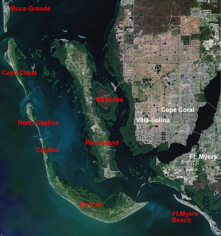 On the sattelite image you see the beautiful world of islands near Cape Coral. With the boat, you will be quickly on the beautiful beaches on Sanibel, Captiva, Ft. Myers Beach... or on one of many small uninhabited islands!